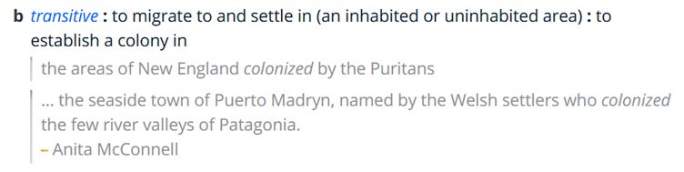 Dictionary definitions vary, but this colonisation definition from Merriam-Webster is a starting point: