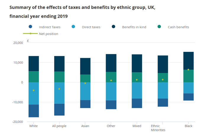 While limited and skilled immigration can bring economic benefits, the mass levels of legal and illegal immigration have created a drain on the public purse. It is simply a fact that, on aggregate, ethnic minorities receive more in government benefits than they pay in taxes. This is shown in the ONS chart below as a positive net position (benefits received minuses taxes paid).