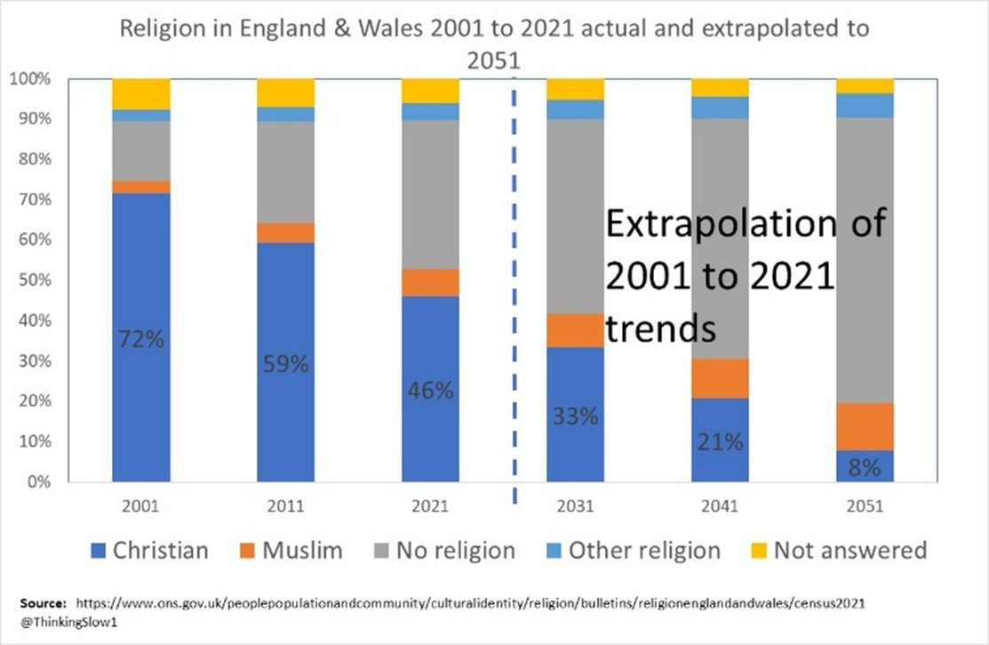 Large scale immigration also creates an increase in the share of certain religions including Islam and Hinduism. The ONS data shows the following change in religious groups from 2001 to 2021 and I have extrapolated the trend for illustrative purposes only. In other words, the chart below is not a prediction: