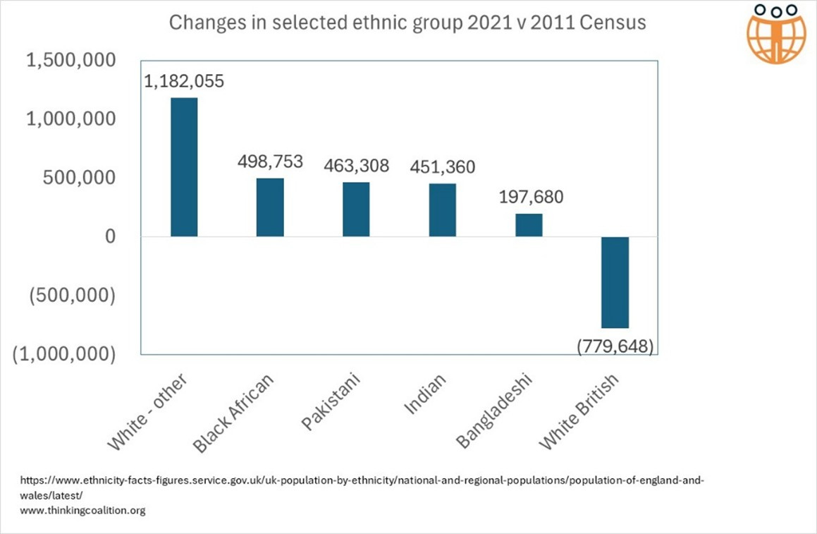 As such, this trend should be a concern only if the ethnic groups that are displacing the White-British category pursue their own cultures within the UK. Movements in population numbers by ethnic group over the ten years between the 2011 census and the 2021 census show a fall of around ¾ million in the White-British category and significant growth in White-other, African, Pakastani, Indian etc.