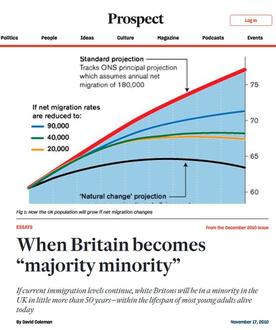 Prospect magazine published ground-breaking population projections in 2010 that suggested the combination of low indigenous fertility and high immigration meant that the “White British” ethnic group were likely become a minority in Britain in 2065 or thereabouts.
