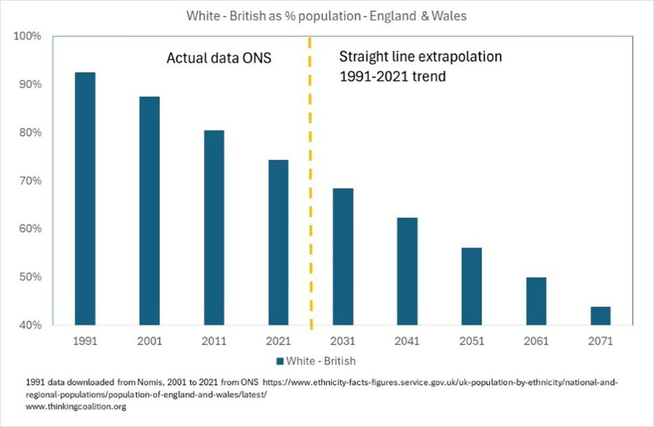 Since that 2010 projection, the outcome was more pronounced because net migration has been higher than the assumptions in the Prospect model. A straight-line extrapolation of Census data from 1991 to 2021 shows that white British will be a minority shortly after 2060, with Asian being the next largest ethnic group with 17.4%.