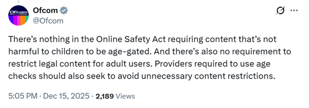 None of our accounts comes anywhere close to producing any content that could be considered to be “primary priority content” or “priority content” or that falls within the scope of Substack’s own list of content restricted to adults. Substack’s imposition of age verification requirements appears to be unjustified. In fact, Ofcom recently made it clear that there are no provisions in the OSA that require age verification steps to be introduced for content that is not harmful (see recent Ofcom post3).’