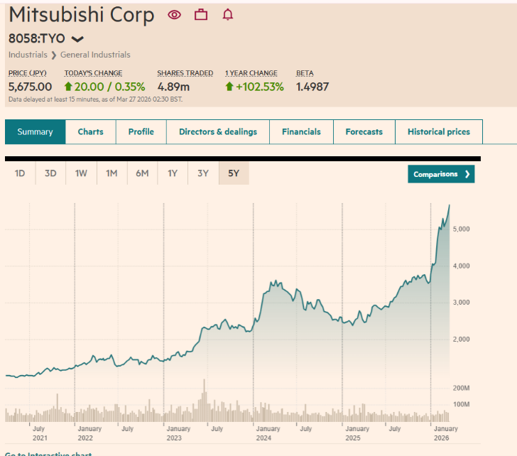 So far that decision has worked out like a charm. His Japan position across five conglomerates (USD 35.4 billion at market) is up 130% over cost. You can do some back-calculation to work out when he bought Mitsubishi (for example) – this works out at an average cost price equivalent to the level in April 2023. He has made 243% over cost over roughly 3 years, equivalent to a 51% rate of return compounded.