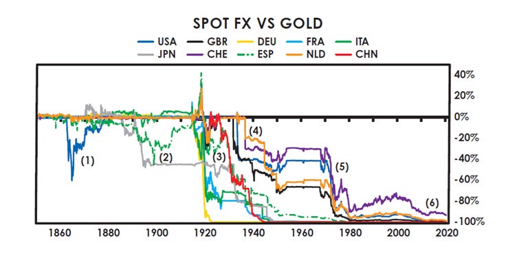 The chart from The Changing World Order illustrates how much gold one nominal unit of currency will buy over time – so if in 1900 that is 1.00 ounce, by 2020 that becomes 0.01 ounces (99% decline). To be fair, it is not surprising that inflation eats away at purchasing power over long periods – the key question is what assets will protect against and even outperform above inflation under different scenarios and to remain agile during the coming dislocation.