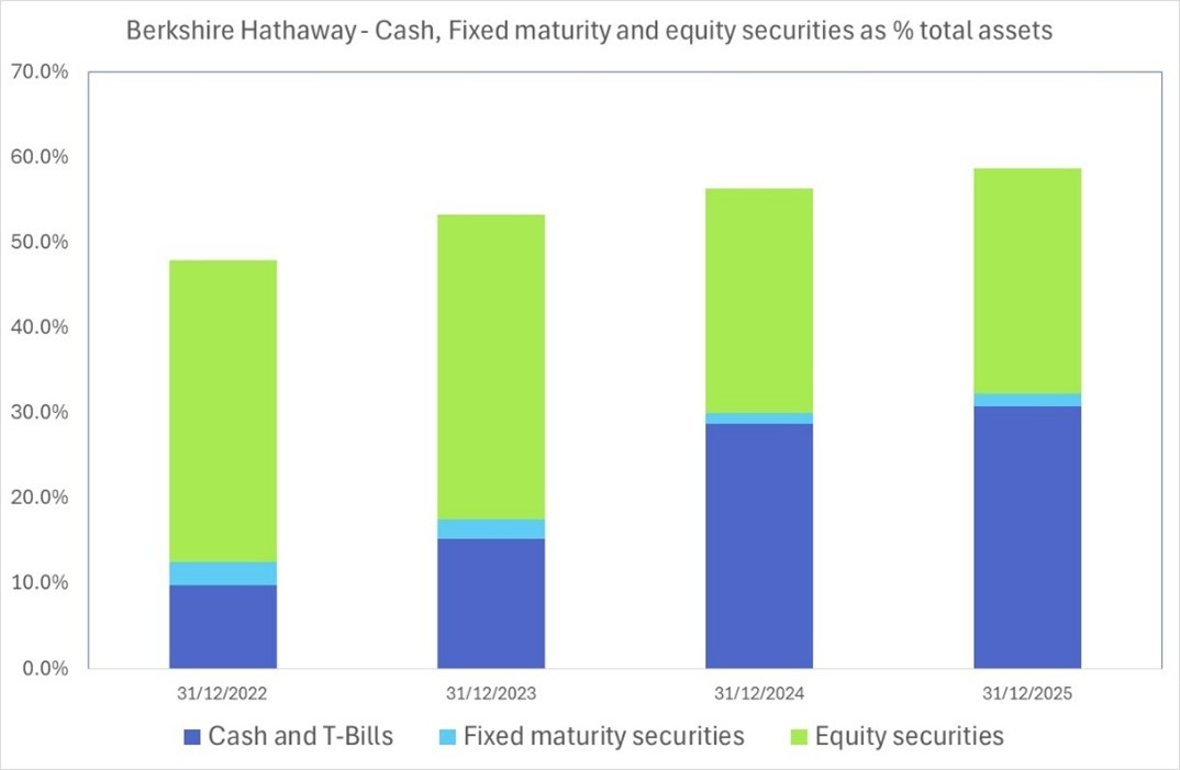Berkshire itself has grown tremendously since 2001 (it now has assets of USD 1.2 trillion) so it makes sense to look at cash and T-bills as a percentage of total assets. The current position - just over 30% of total assets is way, way above its long run level of around 11%. Their equity investments (including equity method investments in companies in which Berkshire owns more than 20%, Heinz and Occidental) have correspondingly shrunk from 35.5% at the end of 2022 to 26.4% at the end of 2025.